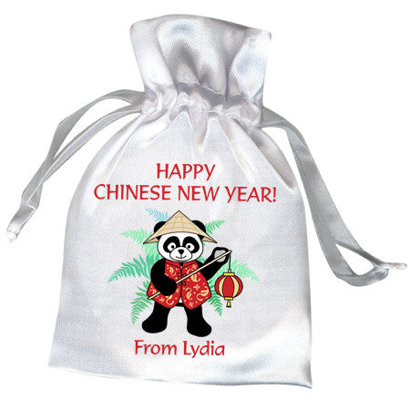 Delight your party guests with white satin drawstring favor bags featuring our adorable Asian lantern pandas - choose from red, pink, purple and blue. Personalize it with 2 lines of text. Price shown is per bag and includes your personalized printing.