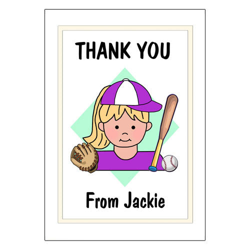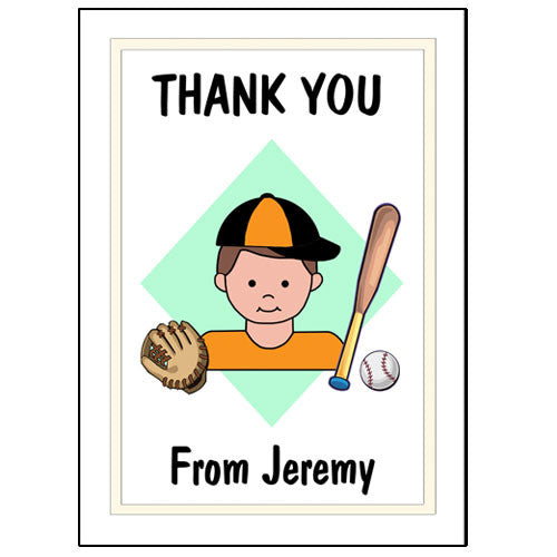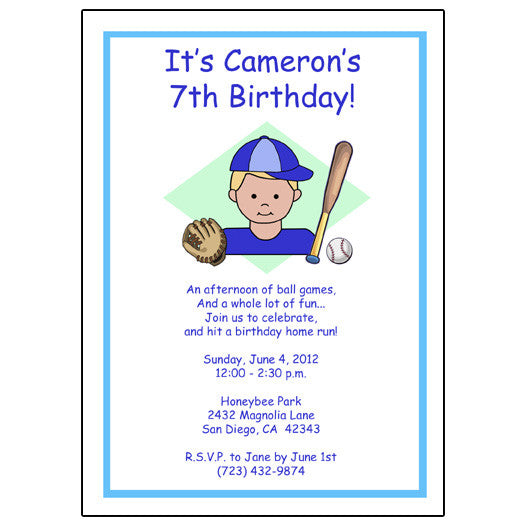 Invite your friends to hit a home run with our baseball birthday party invitations. Add matching baseball thank you notes, favors, and a personalized birthday T Shirt to complete your baseball birthday party theme. All our baseball gifts and party supplies featuring cartoon people can be customized by choosing the skin and hair color of the cartoon child. Looking for a gift for your favorite softball or baseball player or gifts for the whole team? Personalized teddy bears and stuffed animals or ornaments are sure to be a hit.