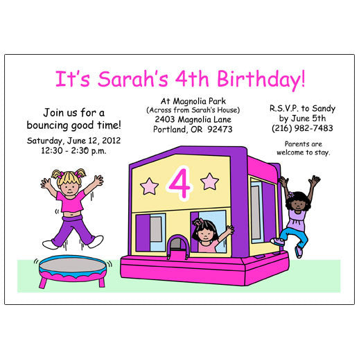 Invite your friends for a bouncing good time with our bounce house birthday party invitations. Add matching thank you notes, favors, and a personalized birthday T shirt to complete your bounce house birthday party theme. All our bounce house birthday party supplies can be customized by choosing the skin and hair colors of the cartoon children.