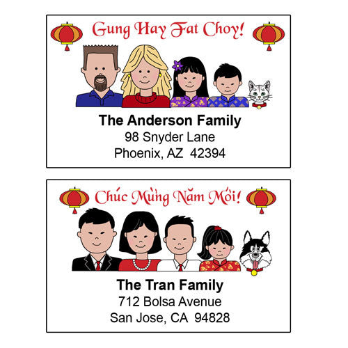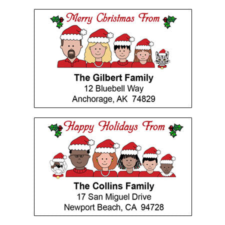 Family and friends will be be sure to smile when you send them cards or letters with return address labels featuring your cartoon family. We offer lots of options for customizing your cartoon people...hairstyles, hair color, skin color, outfits, hats, pets, accessories...everything you need to create fun cards or address labels, and gifts for any occasion!