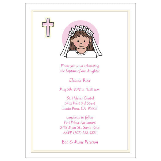 Select any one of our cartoon girls to create a special First Communion invitation for your daughter. Invitations measure 5" x 7" and are white with a pearl foil border and are custom printed with your text.