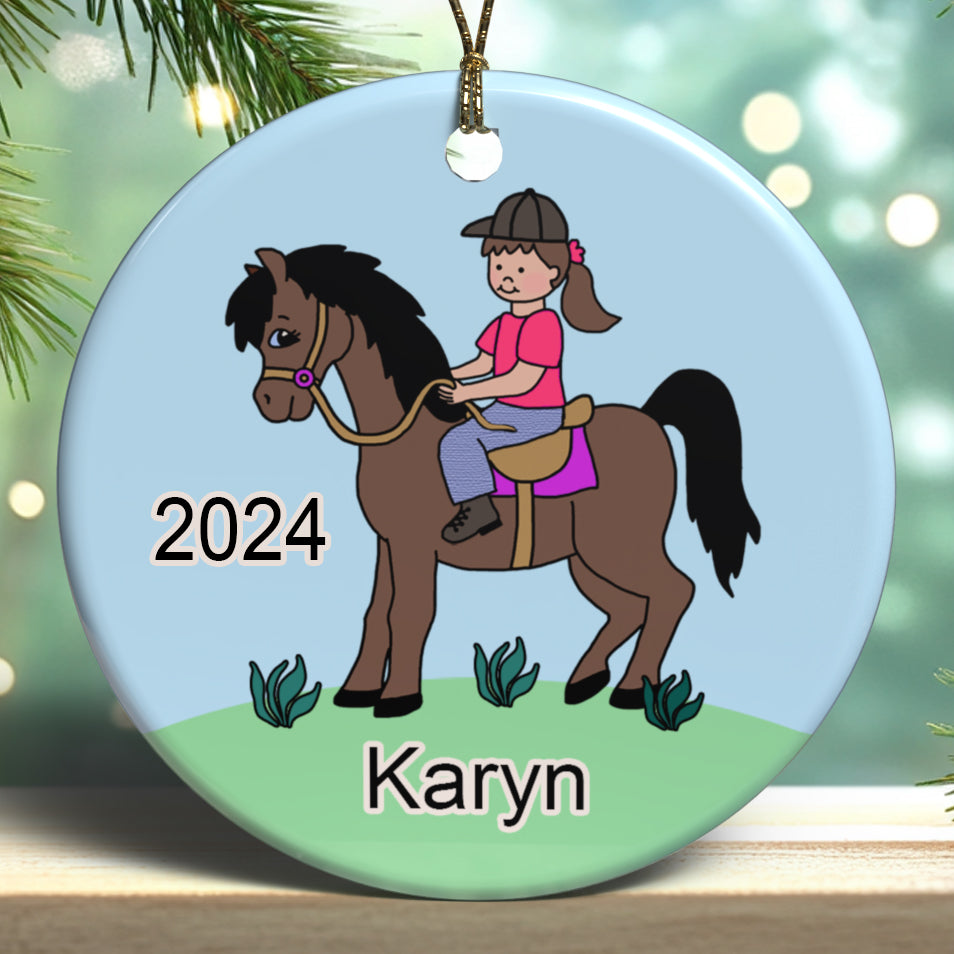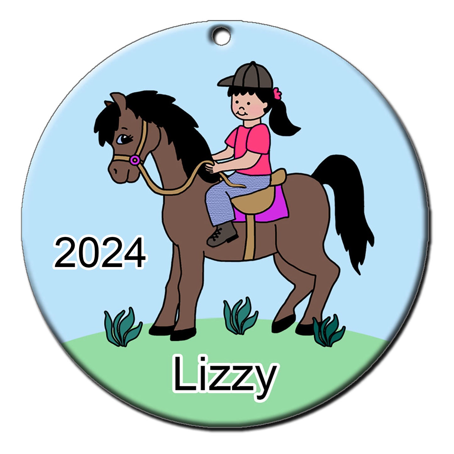 A perfect gift for any girl who loves horses - a personalized Christmas ornament featuring our horseback riding girl design. Choose from 9 girls with different skin and hair colors and 3 horse colors. Personalize it with your child's name and year. 2.75" flat ceramic ornament comes with gold cord for hanging.Share