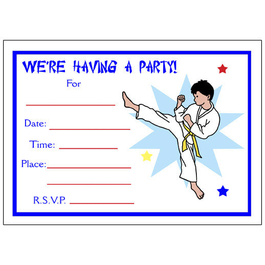 Ki-Yah! Invite your friends to kick off a great time at your karate or tae kwon do party with our fun martial arts birthday party invitations. Add matching thank you notes, favors, and a karate birthday T shirt to complete your martial arts party theme. If you're looking for a perfect gift for your martial arts enthusiast, check out our selection of personalized karate and tae kwon do ornaments and gifts. All our martial arts invitations and gifts can be customized by choosing the skin and hair color of the cartoon child and you can even choose the belt color!