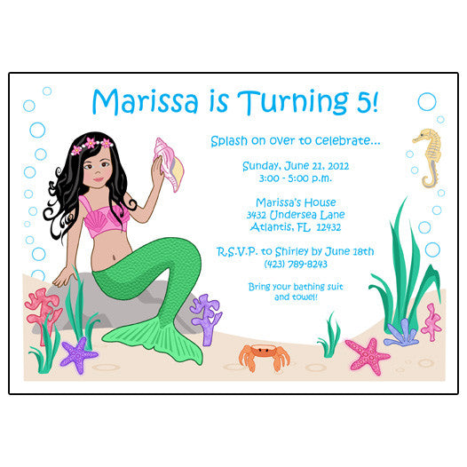 Invite your friends to splash on over to celebrate with our beautiful mermaid birthday party invitations. Add matching mermaid thank you notes, favors, and a personalized birthday T Shirt to complete your mermaid birthday party theme. ll items featuring cartoon mermaids are available with mermaids with a choice of skin or hair color. Mermaid dolls can double as a cute table centerpiece and a gift for the birthday girl after the party.