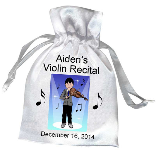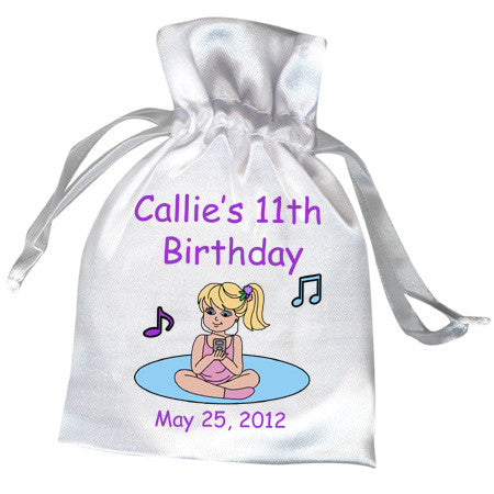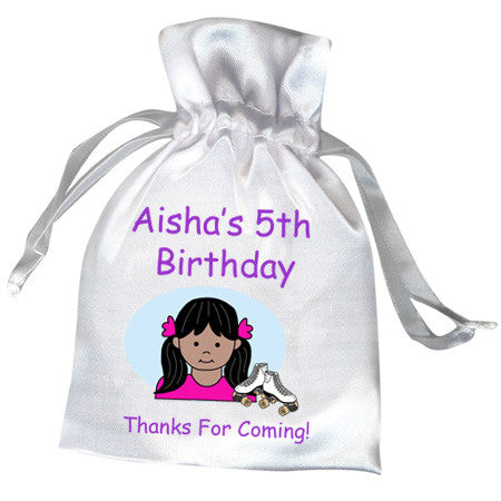 Personalized satin party favor bags are perfect for passing out at all your big events...birthday parties, Baby showers, Adoption showers, First Communions, Graduations, Bridal showers, and more. White satin bags are available in 2 sizes, printed with one of our cute designs and your personalization, and can be filled with small candies, mints, nuts, etc. to make fun favors for your events. All favor bags featuring cartoon people are available with options to choose skin color, hair color, and more!