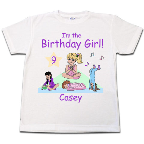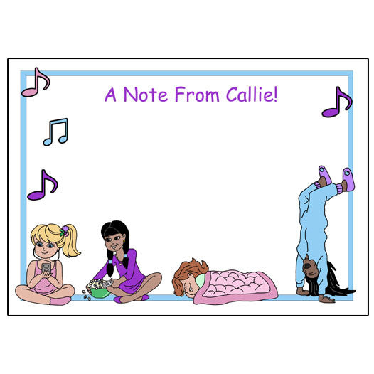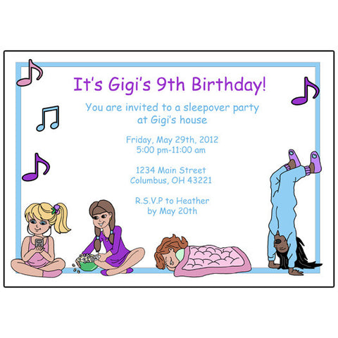 Invite your friends for a night of fun at your sleepover birthday party. Add matching sleepover thank you notes, favors, and a personalized birthday T shirt to complete your sleepover or slumber party theme. All our sleepover birthday party supplies can be customized by choosing the skin and hair color of the cartoon children.