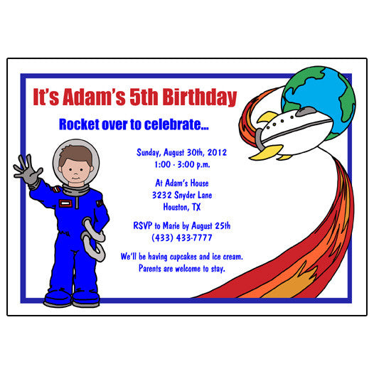 Invite your friends to blast off for some fun at your outer space birthday party! Add matching astronaut thank you notes, favors, and a personalized birthday T shirt to complete your outer space party theme. All our outer space party supplies can be customized by choosing the skin and hair color of the astronaut!