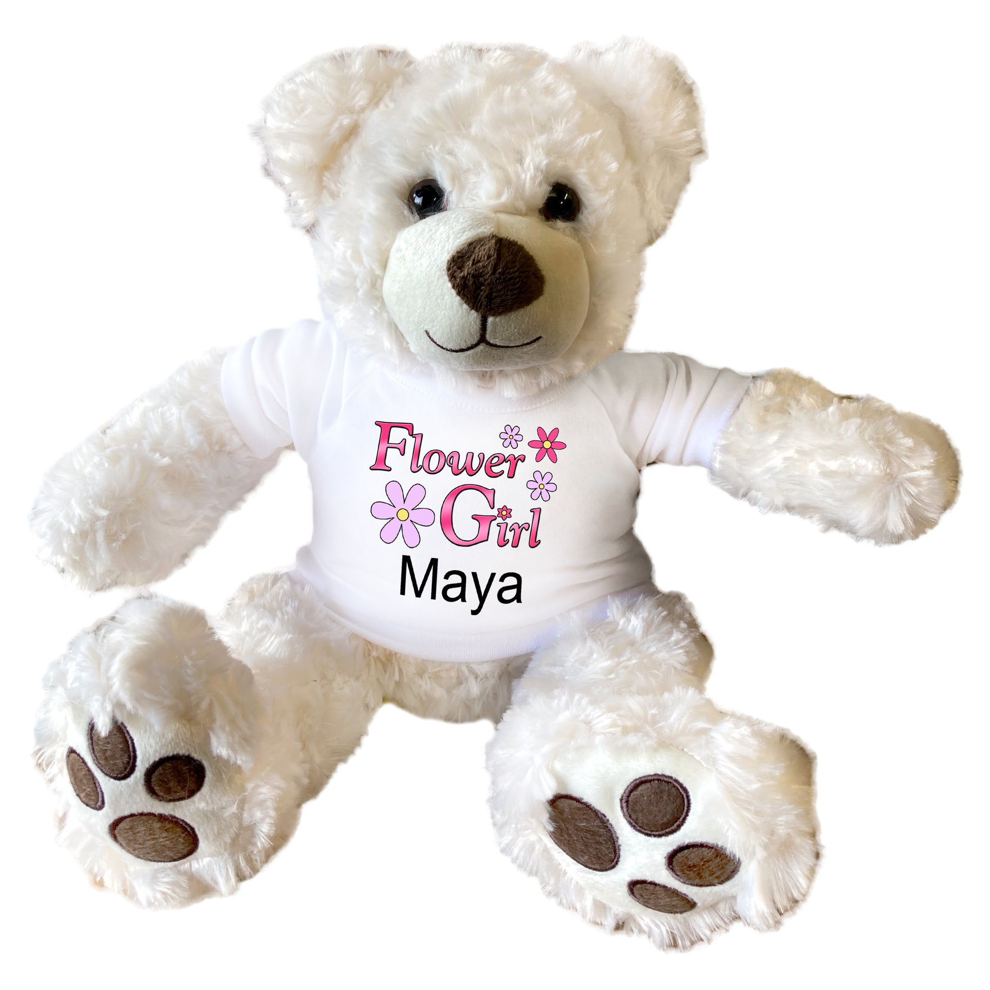 Looking for a fun gift for your flower girl at your wedding?  She will love a personalized flower girl teddy bear made just for her.  Cute 13" pearly white teddy bear will arrive wearing a white T-Shirt with our flower girl design, personalized with the name of your flower girl.  Add the wedding couple's name and date or special thank you message to the back of the shirt (up to 4 lines of text, 15 characters per line) to make a perfect flower girl gift.