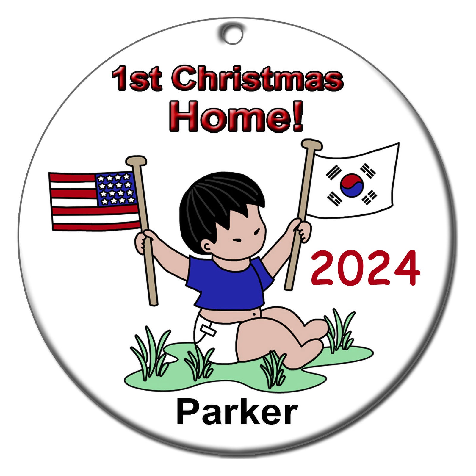 Create a special keepsake ornament to commemorate the adoption of your child and your baby's first Christmas at home! Our flag baby boy design is available with babies holding flags from China, Vietnam, Korea, Cambodia, Guatemala, India, Russia, Ukraine, Ethiopia, Belarus, Azerbaijan, Phillipines, Colombia, Bulgaria, Samoa, Thailand, Mongolia, Taiwan, Haiti, and Kazakhstan. Choose from the phrases "1st Xmas Home" or "Welcome Home", and personalize it with your child's first name and any year. 2.75" flat ceramic ornament comes with gold cord for hanging.Share