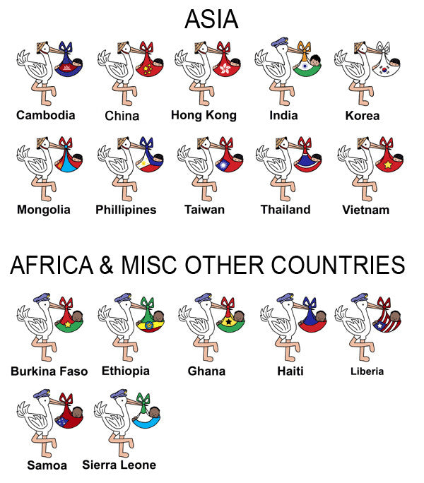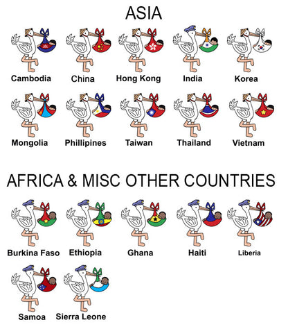 A perfect gift for families traveling to adopt their child from overseas! Our popular adoption stork luggage tag is perfect for identifying your bags on your adoption trip. Front is printed with the stork design, available with baby boys wrapped in flags from 33 countries! Choose from a variety of background colors. Back side is custom printed with your name, address, and phone number. Bag tag measures 4" x 3" and is made of thick, hard durable plastic. Rubber strap for attaching to bag is included.Share