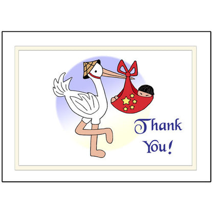 These cute note cards featuring our popular adoption stork are perfect for saying thank you to guests for coming to your adoption baby shower or for thanking family and friends for the gifts they have sent to your new child. Stork is available carrying baby boys wrapped in flags from 33 countries. Cards measure 3 1/2" x 5 and have a pearl foil border. Inside is blank. Price is per pack of 10 note cards with white envelopes.Share