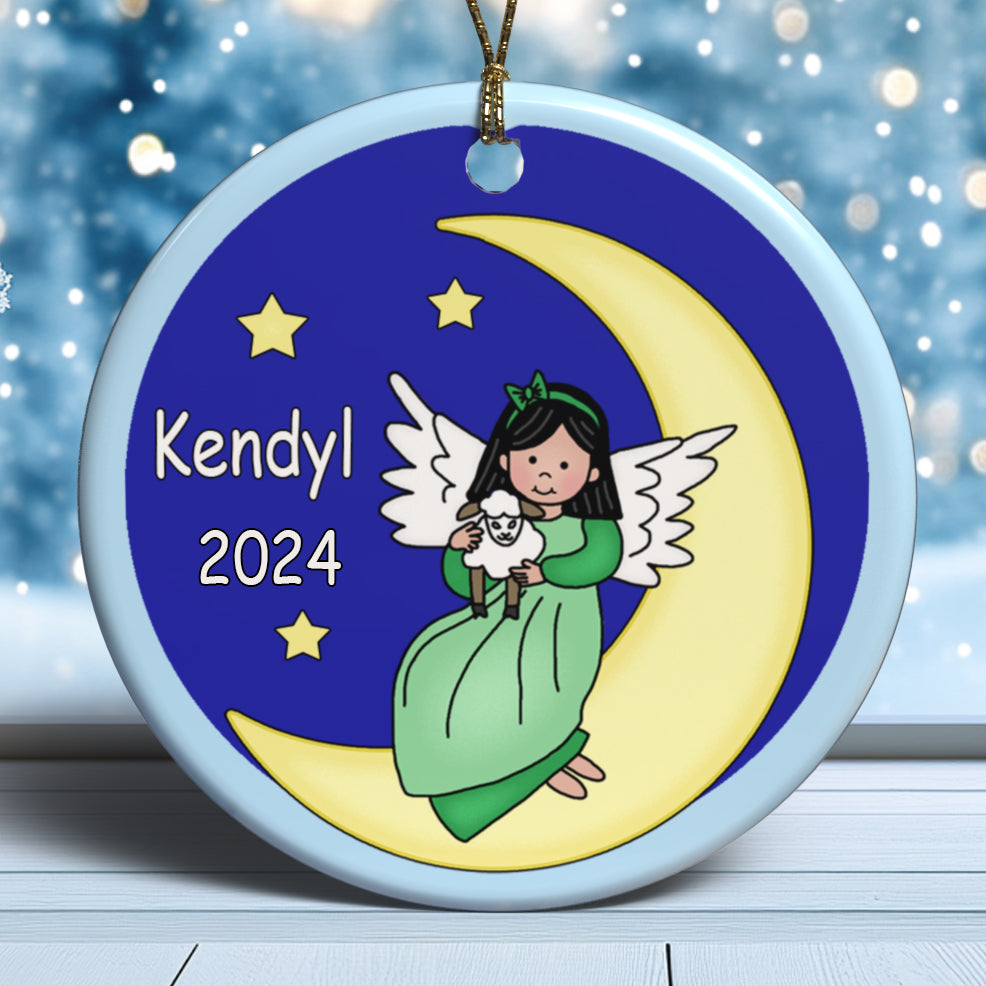 This personalized angel Christmas ornament features a cute little angel sitting on the moon. Select from 9 multicultural angels, including Asian, African American, Hispanic, and Caucasian angels with a variety of hair colors. Personalize it with a name and year. 2.75" flat ceramic ornament comes with a gold cord for hanging.Share