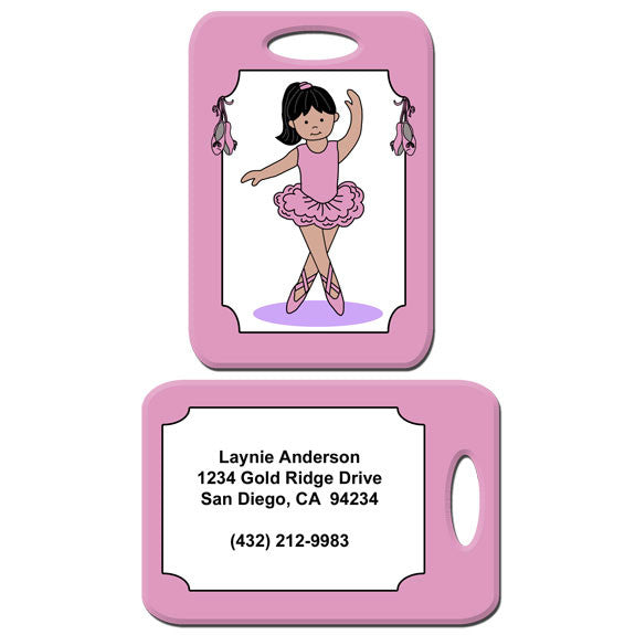 Your little ballerina will dance with delight when she sees this personalized bag tag. Choose from 9 ballerina girls with different skin and hair colors to appear on your bag tag. Back side is custom printed with your name, address, and phone number. A rubber strap for attaching tag to your luggage is included. Bag tag measures 4" x 3" and is made of thick, hard durable plastic.Share
