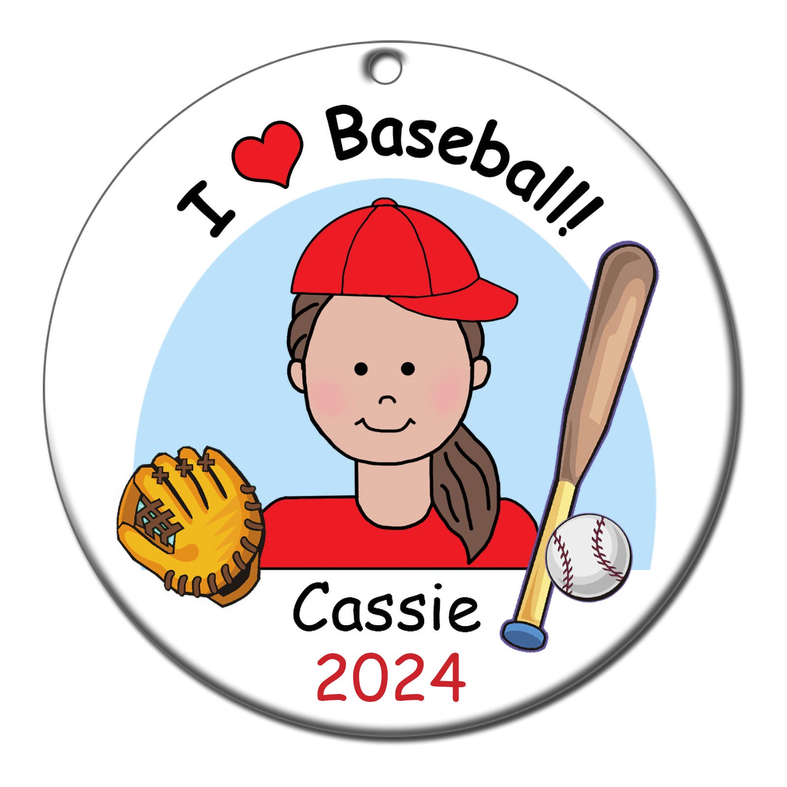 Any girl who loves baseball will love having her own personalized Christmas ornament to hang on the tree. Choose any of our cartoon kids with different skin and hair colors and personalize it with your child's name and the year. 2.75" flat ceramic ornament comes with a gold cord for hanging.Share