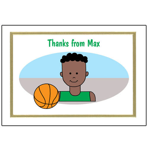 Create special personalized note cards for any kid who loves basketball. Select any one of our cartoon boys to put on your thank you card, and personalize it with your own special message on top, for example, "Thanks from Cooper", or "A Note from Austin". Perfect for sending out thank you notes after your basketball theme birthday party. Cards have a pearl foil border and measure 3 1/2" x 5" They are blank inside and come in packs of 10 with white envelopes included.Share