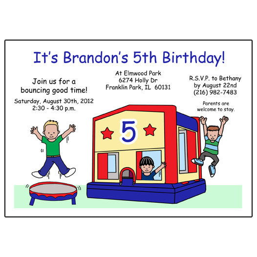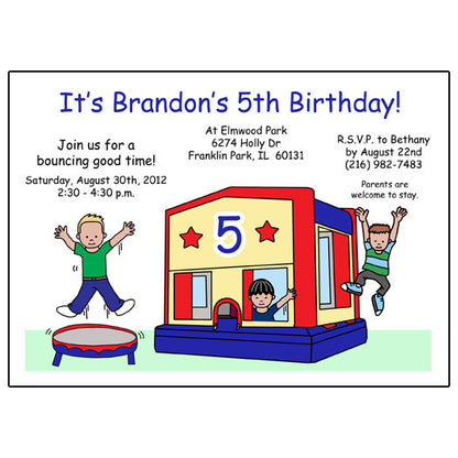 Invite your guests for a bouncing good time with these adorable kids inflatable bounce house birthday party invitations! Choose from a huge selection of boys and girls with different skin & hair colors to appear on your invitations. Pick all boys, all girls, or some of each! 2 versions of the invitation are available, bounce house alone, or bounce house with inflatable slide. 5" x 7" invitations are custom printed in full color with your own headline and wording. Price is per card. Plain white envelopes are included.
