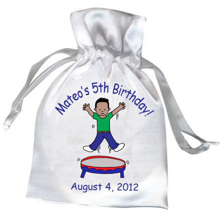 White satin drawstring party favor bags printed with our jumping boy design to match our bounce house birthday party theme! Choose from 9 boys with different skin & hair colors, and personalize it with 2 lines of text.