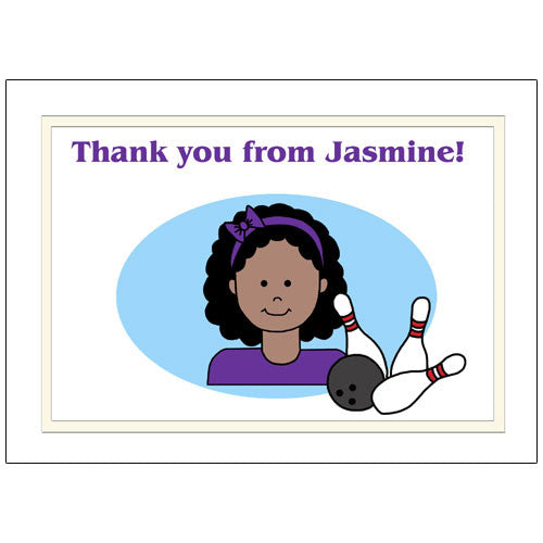 Thank your guests for coming to your bowling party with these fun personalized note cards. Select any one of our cartoon kids to put on your thank you card, and personalize it with your own special message on top, for example, "Thanks from Carol", or "A Note from Naomi". Cards have a pearl foil border and measure 3 1/2" x 5". They are blank inside and come in packs of 10 with white envelopes.