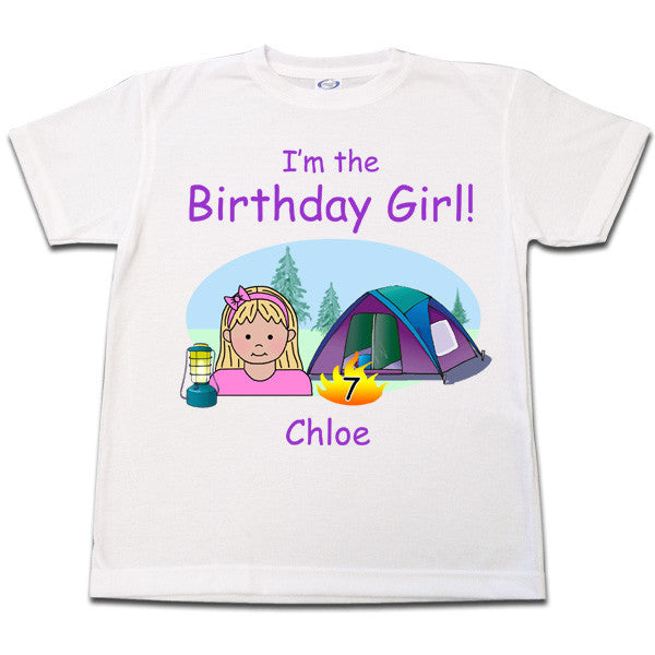 Create a special personalized birthday T shirt for your child to wear to her birthday campout or camping trip. Choose any of our cartoon girls with any skin or hair color and personalize the shirt with your child's name and age. Sure to make the birthday girl feel extra proud.