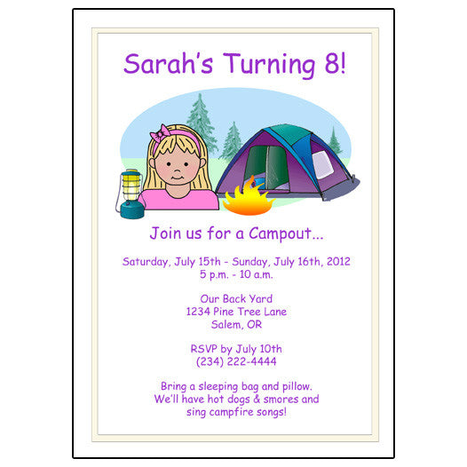 Select any one of our cartoon kids to create a special camping birthday party invitation! Perfect for birthdays or just inviting friends over to share a special wilderness adventure. Invitations measure 5" x 7" and are custom printed in full color with your own headline, wording, and choice of font color.