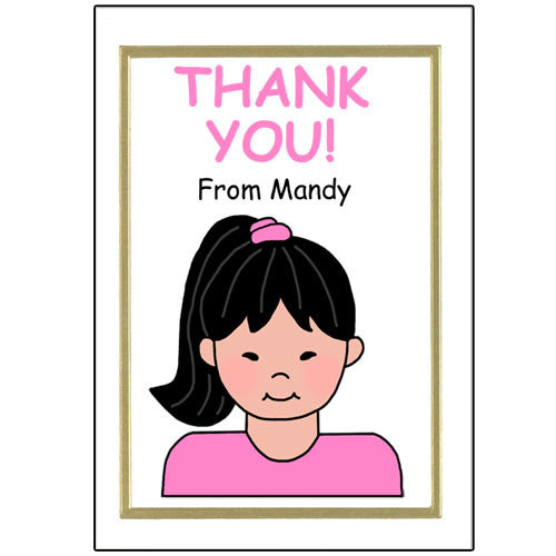 Kids will enjoy having their own personalized thank you notes to send. Select any one of our cartoon girls and personalize it with a name. We will make the top text color match whatever shirt color you choose for the cartoon girl. Cards measure 3 1/2" x 5" and are blank inside. Price is per pack of 10 cards with white envelopes included.