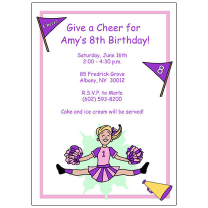 Everyone will cheer for the birthday girl when they receive these fun cheerleading birthday party invitations. Choose from 6 cheerleaders with different skin & hair colors to create a special party invitation. You can even customize the uniform color to match your favorite team or school colors. 5" x 7" cards are custom printed in full color with your own headline, wording, choice of font color. Price is per card. Plain white envelopes are included.