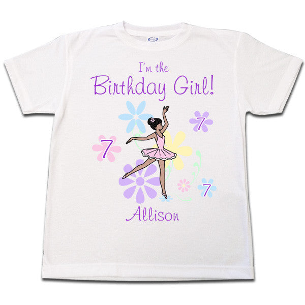 Any girl who loves ballet or dance will love this special personalized birthday T Shirt featuring our Dainty Floral Ballerina design. Choose from 7 ballerinas with different skin & hair colors and personalize the shirt with your child's name and age.
