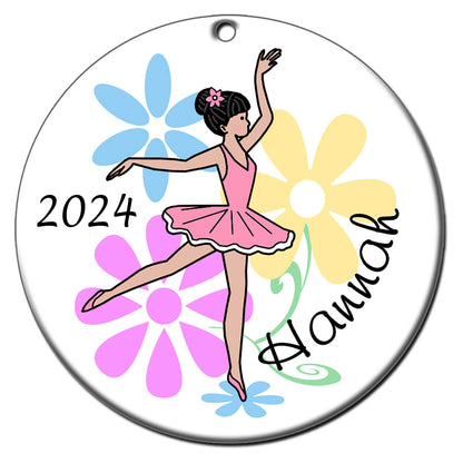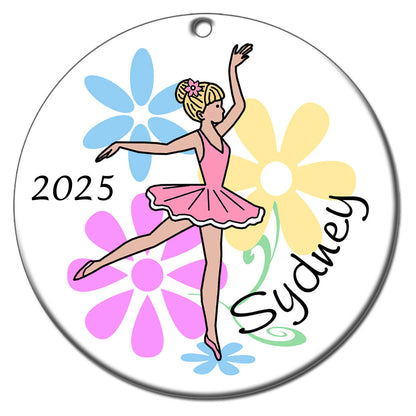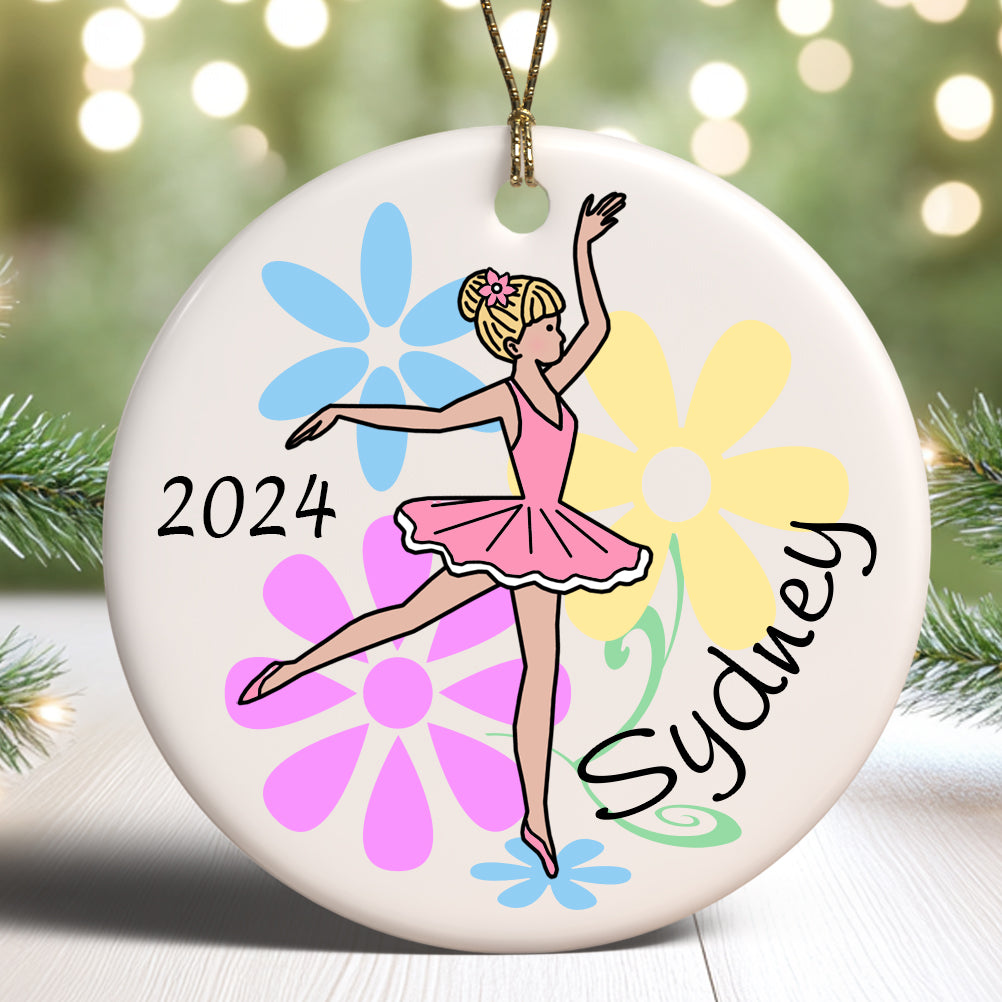 Any girl who loves ballet or dance will be thrilled with this personalized Christmas ornament featuring our Dainty Floral Ballerina design. Choose from 7 ballerinas with different skin and hair colors and personalize it with your child's name and the year. A perfect gift for any girl who loves ballet. 2.75" flat ceramic ornament comes with a gold cord for hanging.Share