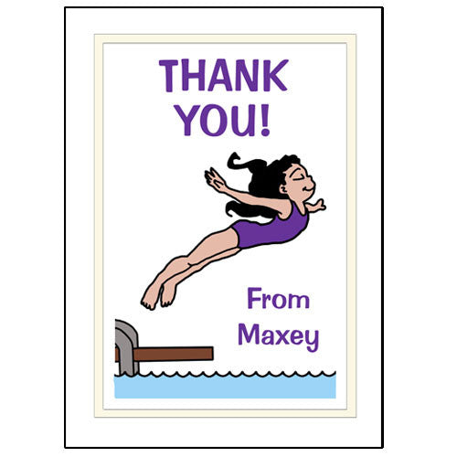 These adorable thank you notes feature our diving girl design and match our diving girl birthday party invitations. Perfect for saying thanks to your guests after your pool party. Choose from 6 girls with different skin and hair colors, and personalize it with your child's name and short message. Cards have a pearl foil border and measure 3 1/2" x 5". Inside is blank. Price is per pack of 10 cards with white envelopes included.Share