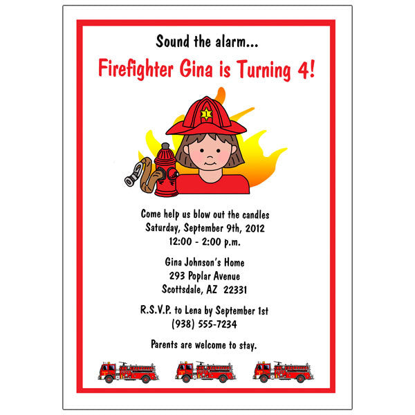 Sound the fire alarm - it's time to party! Select any one of our cartoon girls to create a special birthday party invitation for your favorite little firefighter. 5" x 7" cards are custom printed in full color with your own headline and wording. Price is per card. Plain white envelopes are included.