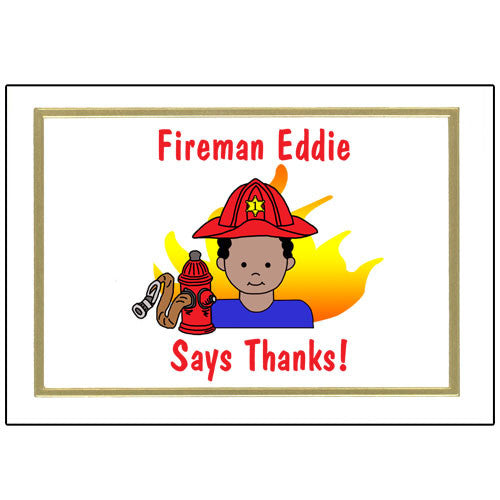 Thank your guests for coming to your firefighter theme birthday party with these fun personalized note cards. Select any one of our cartoon boys to put on your thank you card, and personalize it with your own special message on top, for example, "Thanks from Timmy", or "A Note from Gavin". Cards have a gold foil border and measure 3 1/2" x 5". Inside is blank. Price is per pack of 10 with white envelopes included.Share