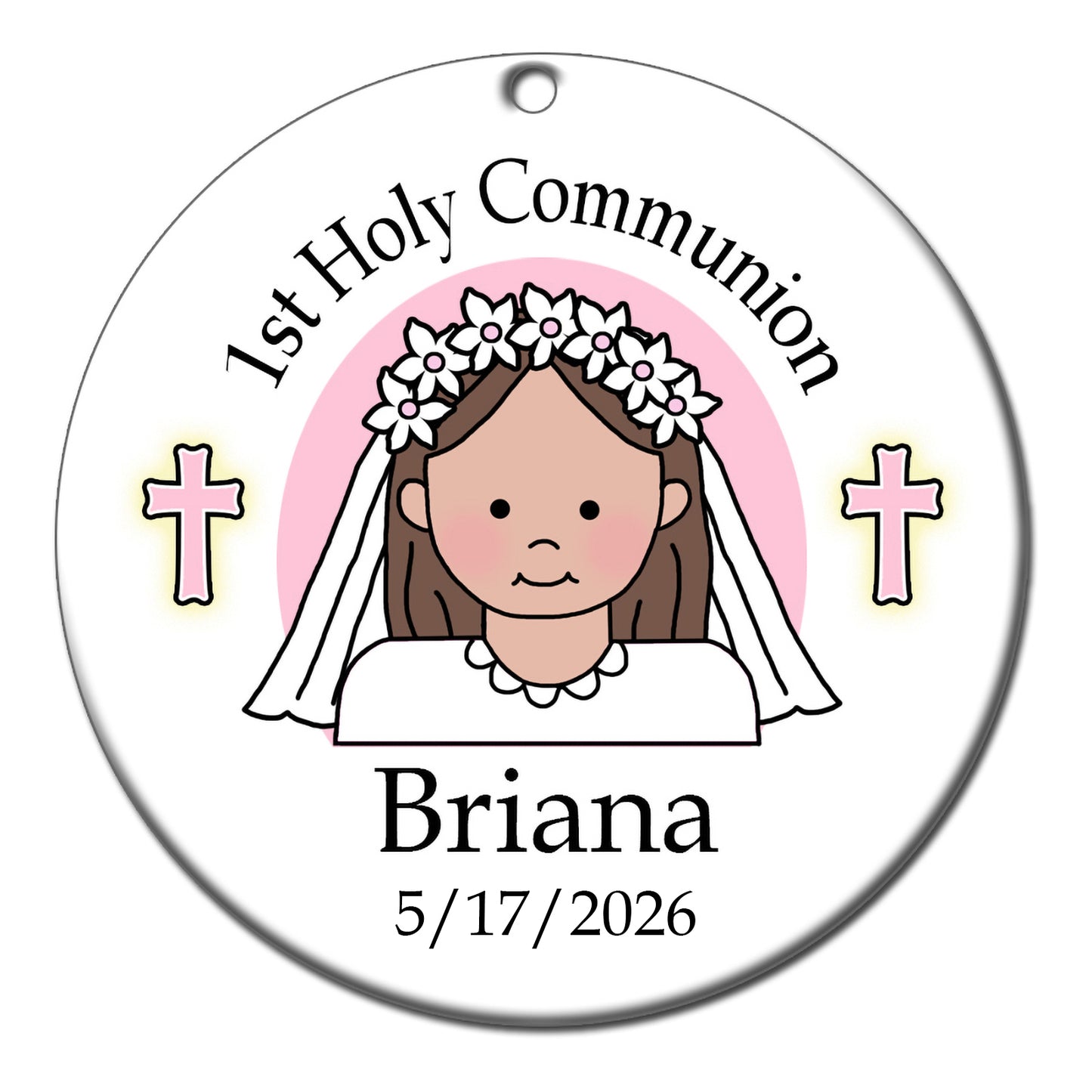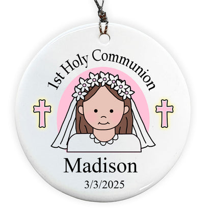 Commemorate your child's First Communion with a special ornament that will be a treasured keepsake for years to come. Choose any of our cartoon girls and personalize it with your child's name and date of First Communion. 2.75" flat ceramic ornament comes with gold cord for hanging.