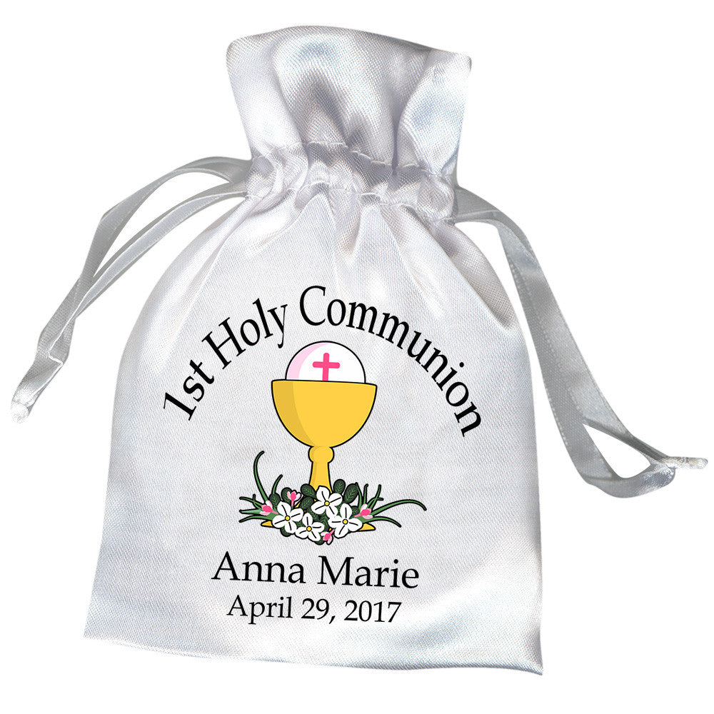 First Communion favor bags featuring our Chalice with flowers design are the perfect favor to give your guests on your child's special First Communion day. White satin drawstring party favor bags can be personalized with your child's name and First Communion date. Price shown is per bag and includes your personalized printing.