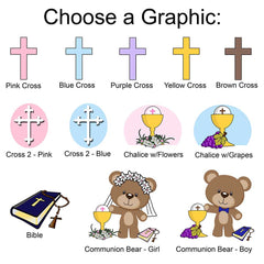 - 13" brown Vera Bear wearing a t-shirt printed with your choice of one of our graphics and your child's name and Communion date on the front.