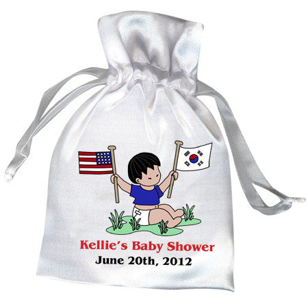 These white satin drawstring favor bags feature our popular flag baby boy design for international adoption and are personalized with your own special message and the date of your event. Choose baby boys from 24 countries.
