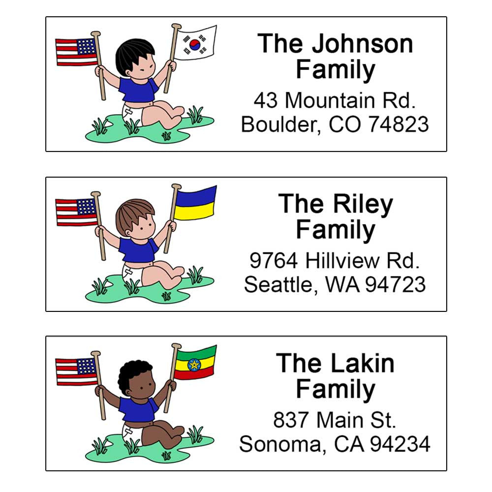 These adorable return address labels feature a baby boy holding flags from your choice of countries....20 countries available. Choose baby boys from China, Vietnam, Korea, Cambodia, Guatemala, India, Russia, Ukraine, Ethiopia, Belarus, Azerbaijan, Phillipines, Colombia, Bulgaria, Samoa, Thailand, Mongolia, Taiwan, Haiti, and Kazakhstan. Perfect for putting on your adoption announcements or baby shower invitations with an international adoption theme. Glossy white labels measure 2.6" W x 1"H. Price shown is for one sheet of 30 labels.Share