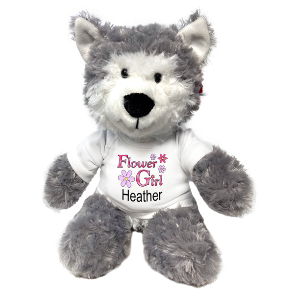 Looking for a fun gift for your flower girl at your wedding? She will love a personalized stuffed animal made just for her. Cute 12" plush husky dog (or it could be a wolf!) will arrive wearing a white T-Shirt with our flower girl design, personalized with the name of your flower girl. Add the wedding couple's name and date or special thank you message to the back of the shirt (up to 4 lines of text, 15 characters per line) to make a perfect flower girl gift.