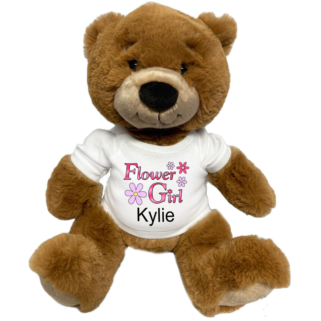 Looking for a fun gift for your flower girl at your wedding? She will love a personalized flower girl teddy bear made just for her. Extra soft, high quality 14 inch ginger colored teddy bear by Aurora Plush will arrive wearing a white T-Shirt with our flower girl design, personalized with the name of your flower girl. Add the wedding couple's name and date or special thank you message to the back of the shirt (up to 4 lines of text, 15 characters per line) to make a perfect flower girl gift.