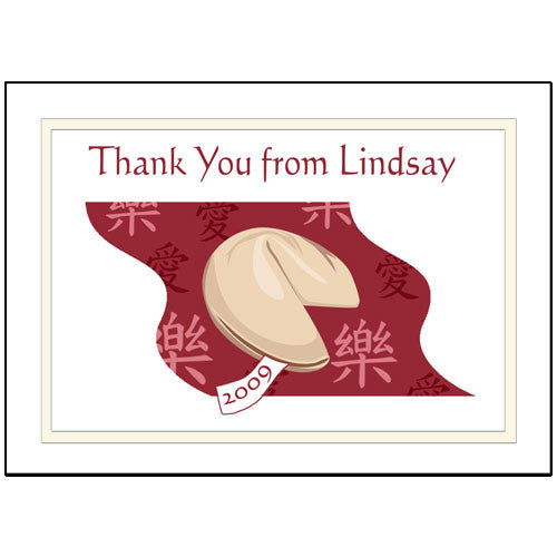 A fun way to say thank you....these folding note cards feature a Chinese fortune cookie and are personalized with a headline of your choice. The note coming out of the fortune cookie will say the current year unless otherwise specified. Cards have a pearl foil border and the inside is blank. Price is per pack of 10 note cards with white envelopes included.Share