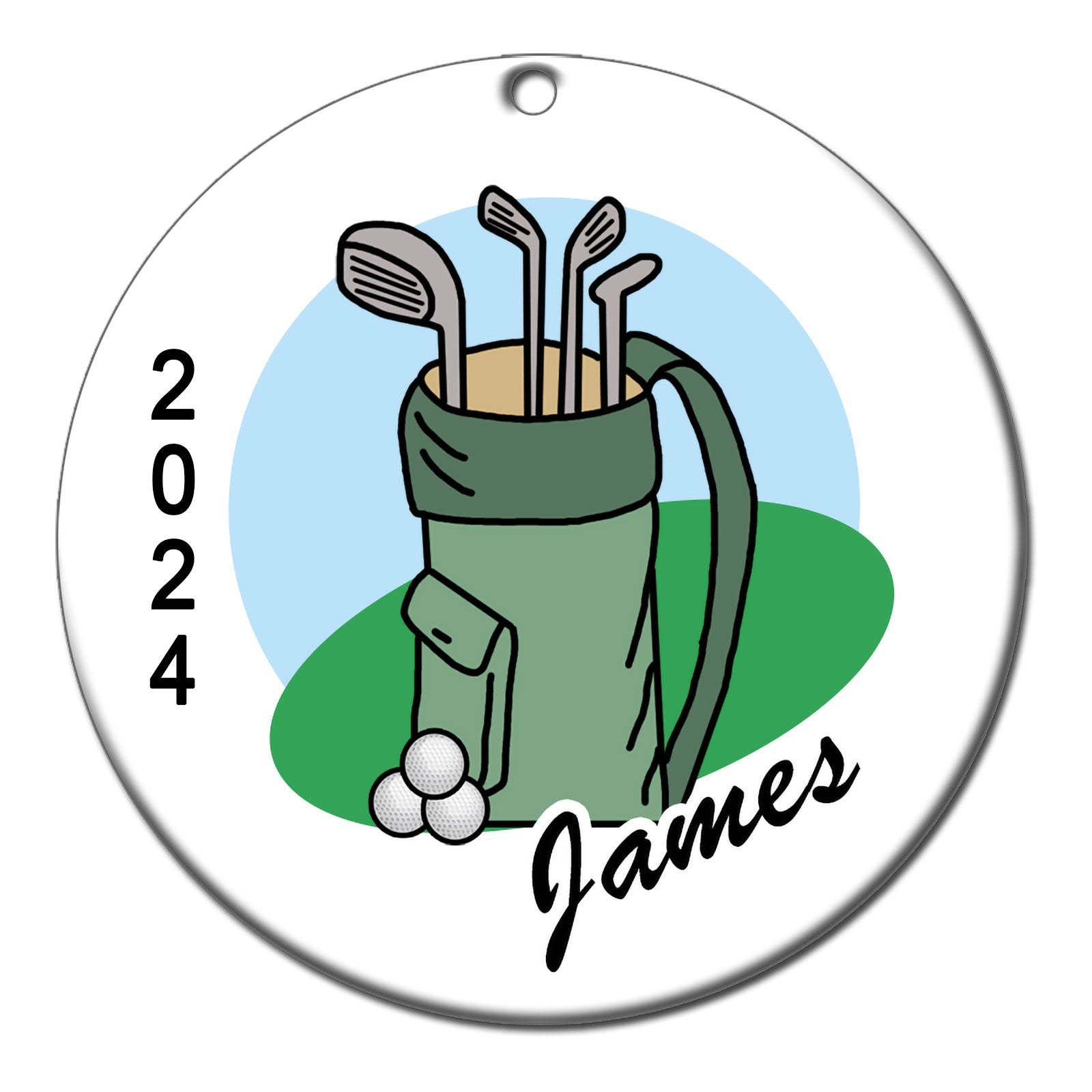A perfect gift for any golfer - a personalized Christmas ornament featuring golf clubs and a golf ball, personalized with a name and year. 2.75" flat ceramic ornament comes with gold cord for hanging.Share