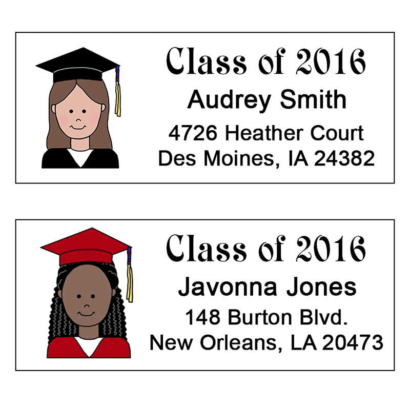 Proudly tell the world that you're graduating this year with these fun return address labels to put on your graduation announcements or grad party invitations! Select any one of our cartoon girls or women, choose a cap and gown color, and personalize the labels with your name, return address, and graduation year. A perfect accent for your graduation announcements, party invitations, or thank you cards.