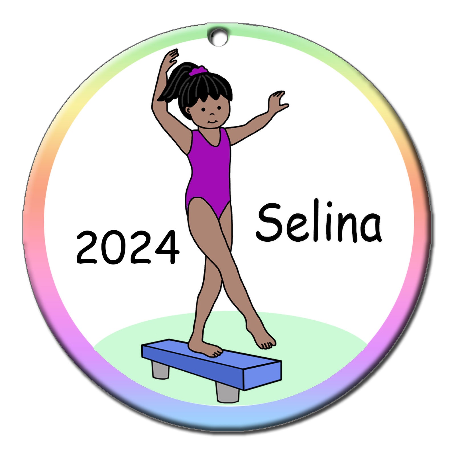 A perfect gift for any girl who loves gymnastics - a personalized Christmas ornament featuring our gymnastics beam design. Choose from 9 gymnasts with different skin and hair colors and personalize it with your child's name and the year. 2.75" flat ceramic ornament comes with gold cord for hanging.