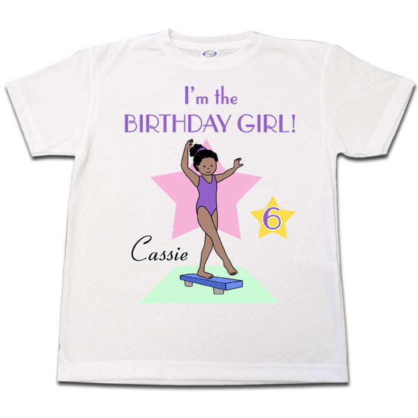 Any birthday girl who loves gymnastics will feel extra proud wearing this personalized gymnastics birthday T Shirt. Choose from a selection of gymnasts with different skin and hair colors and personalize it with your child's name and age. Perfect for wearing to your gymnastics birthday party.