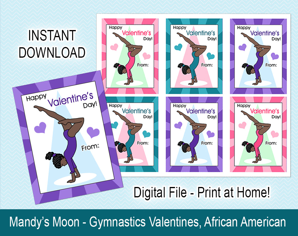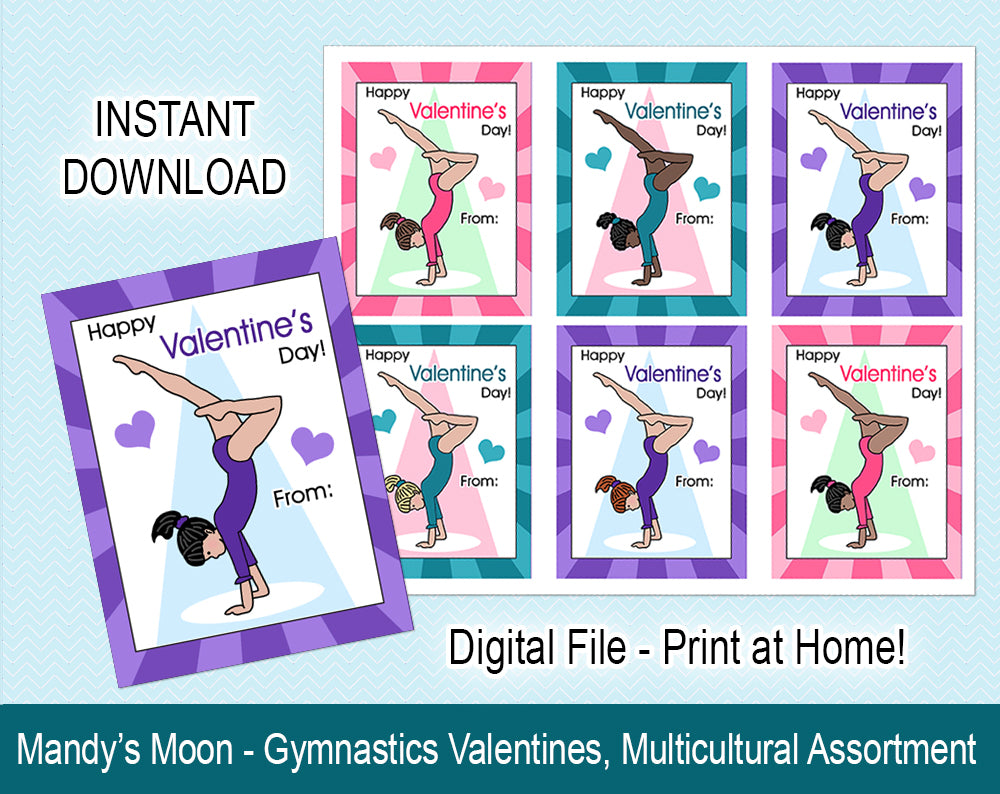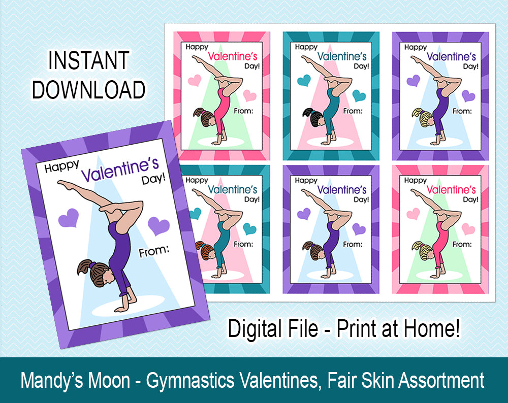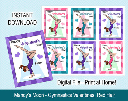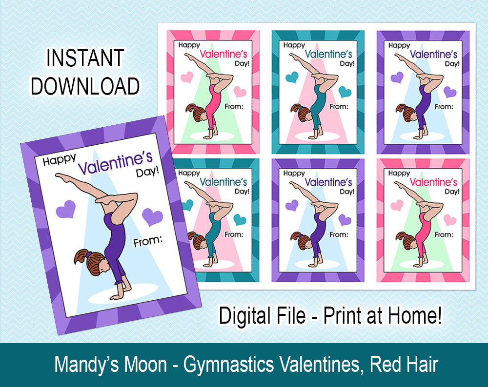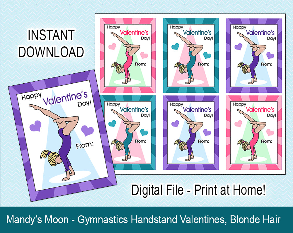 Your gymnast will love giving out these special gymnastics Valentines to all their friends at school! You will receive a .jpg file with 6 handstand girl Valentines that can be printed on an 8.5 x 11 page (we recommend printing on cardstock), and cut out (a paper cutter works well for this purpose). Individual cards measure 3" x 4".