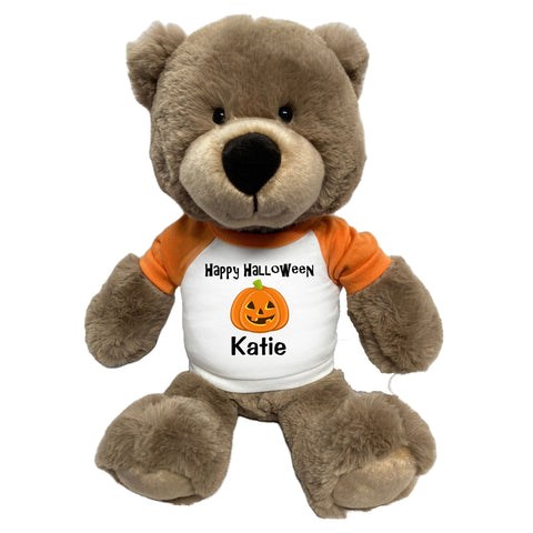 Looking for a fun Halloween gift that does NOT involve candy? This adorable black plush teddy bear is perfect for wishing someone an extra special Halloween. A Halloween teddy bear also makes a fabulous center piece for your table at a Halloween party. 13" black bear will arrive at your haunted house wearing an orange sleeved t-shirt printed with the words "Happy Halloween", a pumpkin graphic, and personalized with any name.