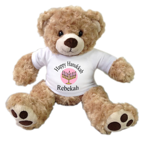 Looking for a fun Hanukkah gift? 13" Coco Bear by Aurora Plush will arrive wearing a white t-shirt printed with the words "Happy Hanukkah", a menorah graphic, and personalized with any name. Choose light blue, royal blue, pink, or light green background for the menorah design.