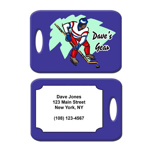 This personalized hockey bag tag is perfect identification for your child's backpack or bag of ice hockey gear. Front side is printed with our hockey player design - choose fair, medium, or dark skin to match your child. Back side is custom printed with your name, address, and phone number. Bag tag measures 4" x 3" and is made of thick, hard durable plastic. Rubber strap for attaching tag to your luggage is included.Share