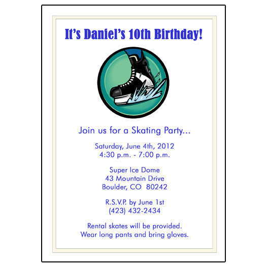 Perfect for a boys ice skating or hockey birthday party! 5" x 7" invitations feature a hockey skate design and have a pearl foil border and are custom printed in full color with your own headline, wording, and choice of font color. Price is per card. Plain white envelopes are included.