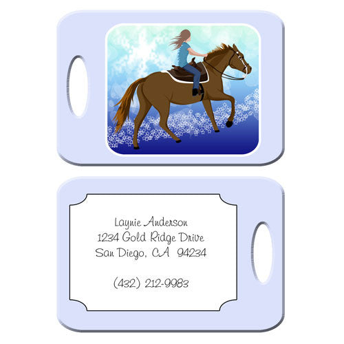This personalized bag tag featuring our beautiful Horse Dreams design is perfect identification for your child's backpack or riding gear. Choose from 6 girls with different skin and hair color options. Back side is custom printed with your name, address, and phone #. Bag tag measures 4" x 3" and is made of thick, hard durable plastic. Rubber strap for attaching to your bag is included.Share