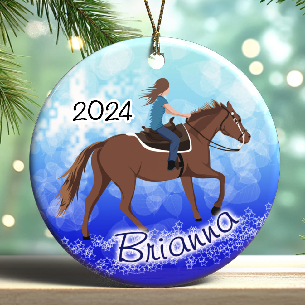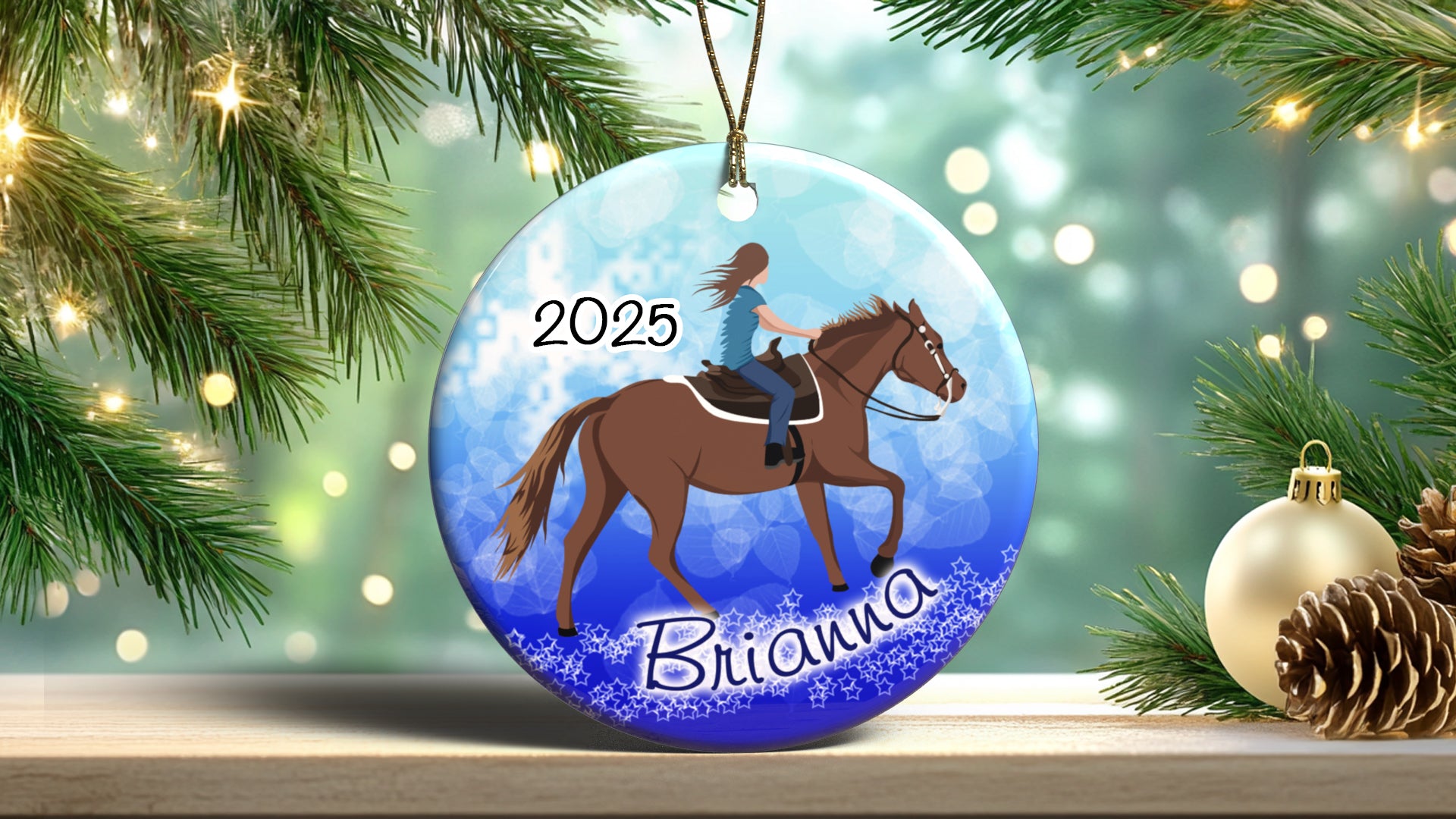 Any girl who loves horses will love this personalized Christmas ornament featuring our beautiful Horse Dreams design in classic blue. Choose from 6 girls with different skin colors and 3 horse colors and personalize it with name and year. 2.75" flat ceramic ornament comes with gold cord for hanging.Share